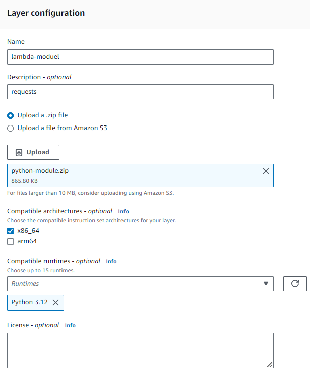 새로 생성된 zip 파일을 선택한 후 업로드하고 아키텍처와 런타임을 선택하자.