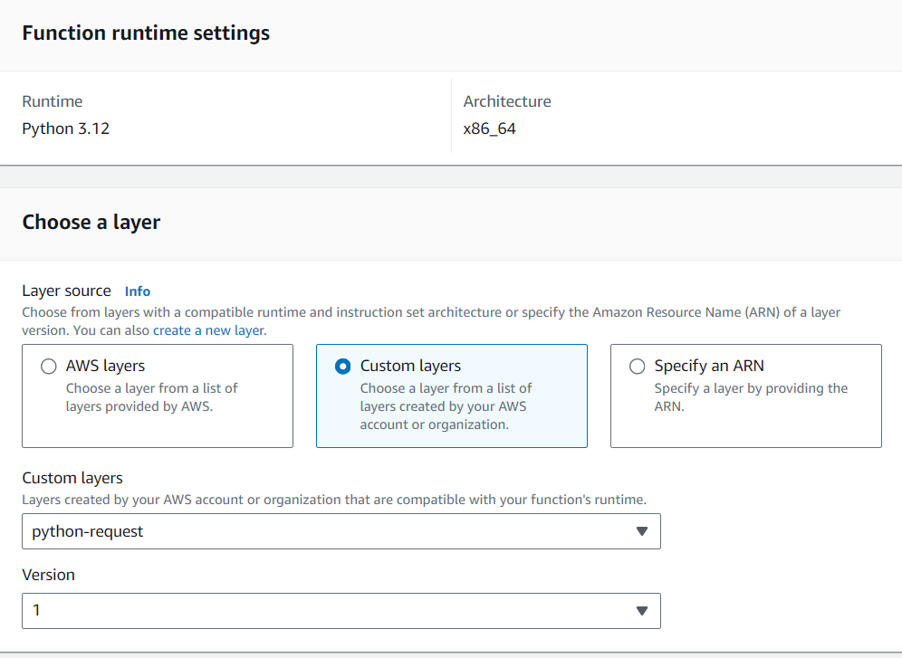 이 리포지토리의 Layer을 사용하는 경우 "specify an ARN" 섹션에서 "choose a layer"으로 변경하고 ARN을 등록하기만 하면 된다.